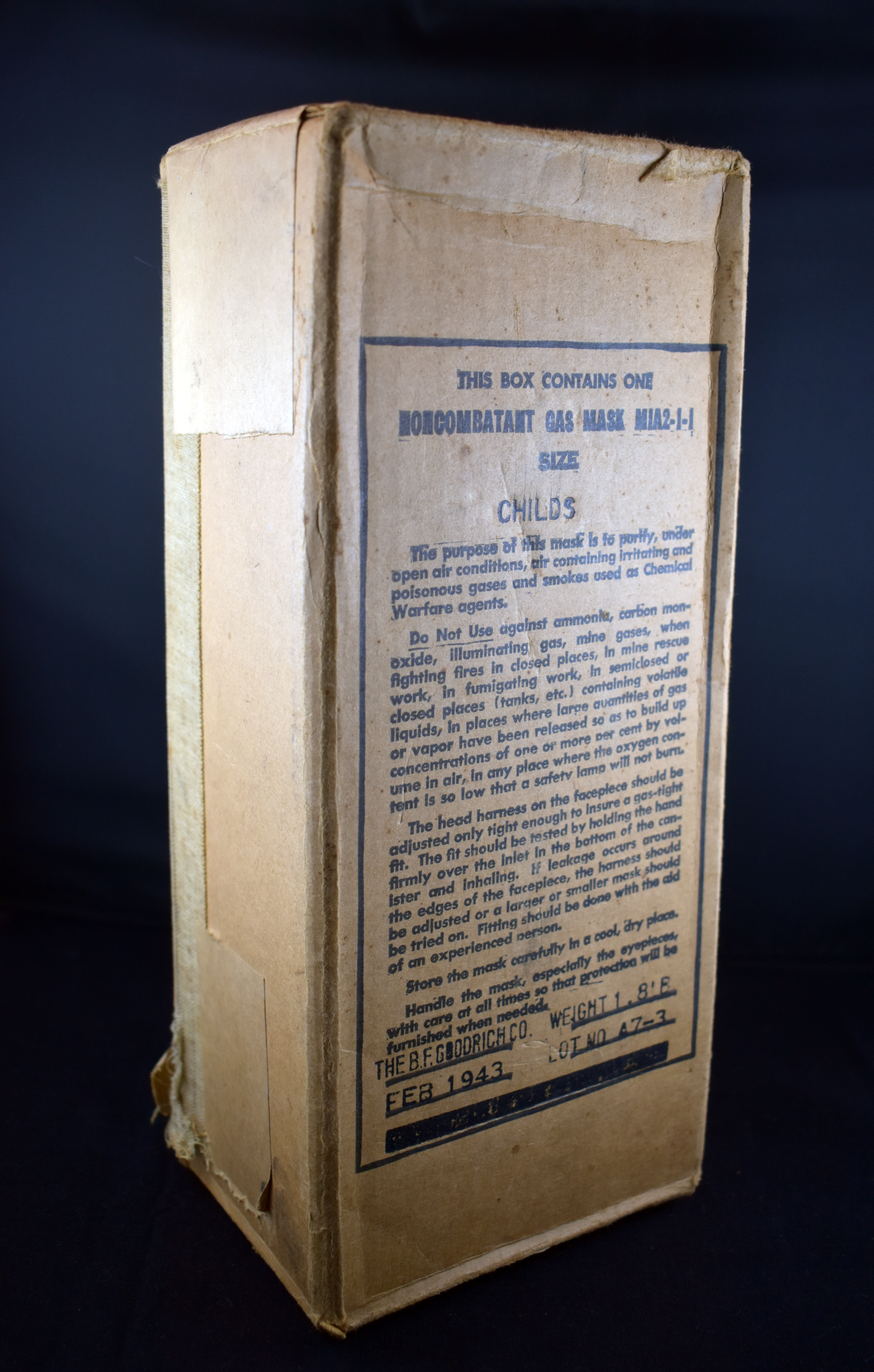 On front in black ink “Apaco / THE FIRST NAME IN PACKAGING / ATLANTA PAPER COMPANY / ATLANTA, G.A. / CERTIFICATE / OF BOX / MAKER / THIS BOX CONFORMS TO ALL / CONSTRUCTION REQUIRE- / MENTS OF CONSOLIDATED / FREIGHT CLASSIFICATION / BURSTING / TEST 200 LBS. PER / SQ. INCH / SIZE / LIMIT 75 INCHES / GROSS / WT. LT. 65 LBS.” with “THIS BOX CONTAINS ONE / NONCOMBATANT GAS MASK MA2-1-1 / SIZE / CHILD / The purpose of this mask is to purify, under / open air conditions, air containing irritants and / poisonous gases and smokes used as Chemical / Warfare agents. / Do not use against amonia, carbon mon- / oxide, illumination gas, mine gases, when / fighting fires in closed places, in mine rescue / work , in fumigation work, in semiclosed or / closed places (tanks etc.) containing volatile / liquids in places where large quantities of gas / or vapor have been released so as to build up / concentrations of one or more per cent by vo- / lume in air, in any place where the oxygen con- / tent is so low that safety lamp will not burn. / The head harness on the facepiece should be / adjusted only tight enough to insure a gas-tight / fit. The fit should be tested by holding the hand / firmly over the inlet in the bottom of the can- / ister and inhaling. If leakage occurs around / the edges of the facepiece, the harness should / be adjusted or a larger or smaller mask should / be tries on. Fitting should be done with the aid / of an experienced person. / Store the mask carefully in a cool, dry place. / Handle the mask, especially the eyepieces, / with care at all times so that protection will be / furnished when needed. / THE B.F.GOODRICH CO. WEIGHT 1.8’B. / FEB 1943 LOT NO. A7-3” on back in black ink.