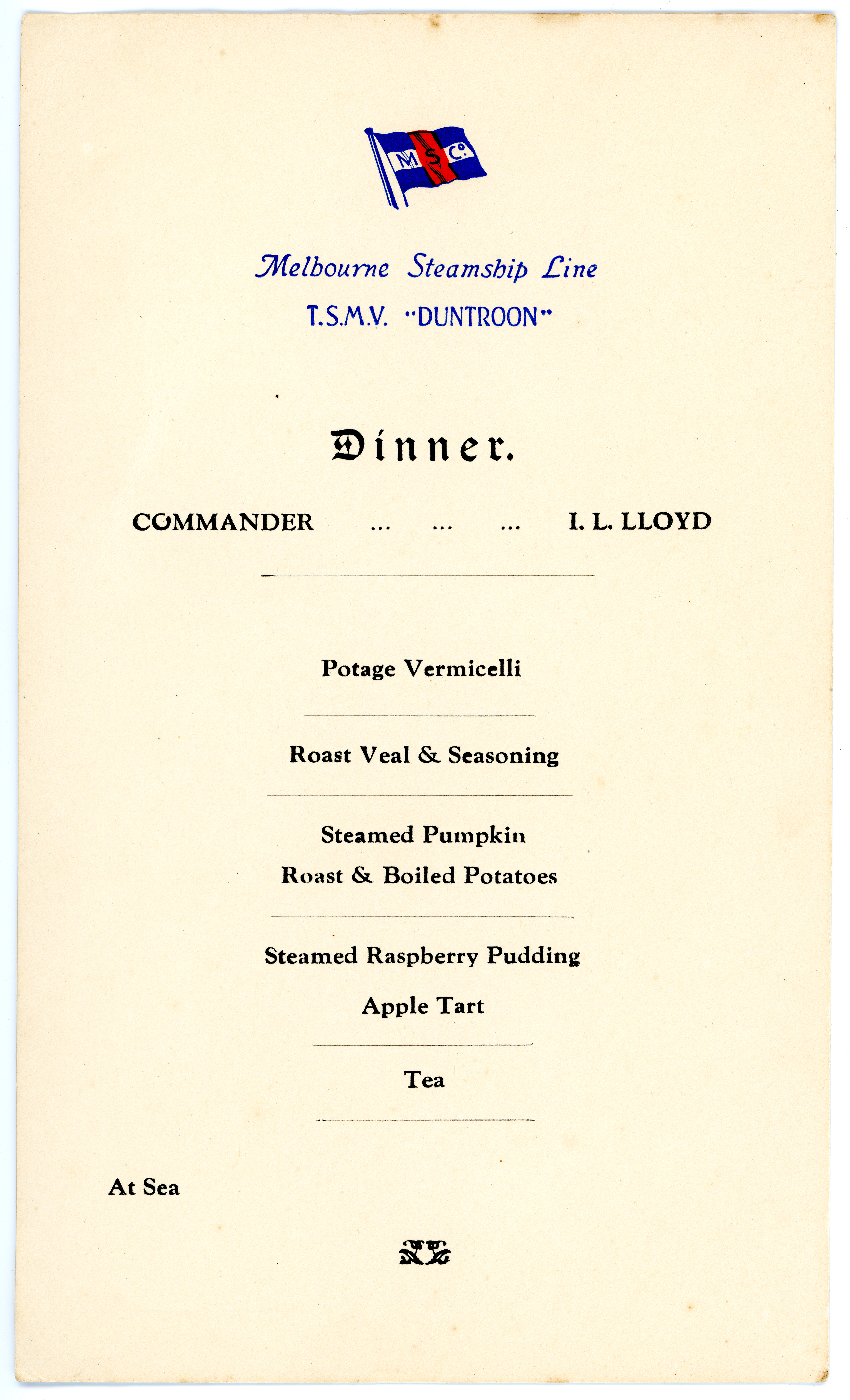 1941Dinner Menu Card, single page, from “Melbourne Steamship Line / T.S.M.V. ‘DUNTROON’ “, dated 23rd July 1941. Commander listed as “I.L. LLOYD”, and the vessel flag logo top centre in blue, red and white colours.