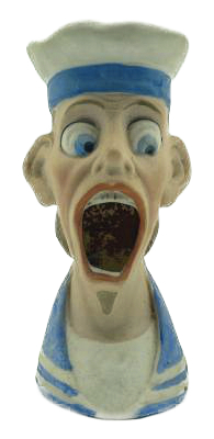 c. 1915World War One era, hollow, bisque pottery caricature of the head and shoulders of a German sailor. He is wearing a blue and white sailor's suit and cap.