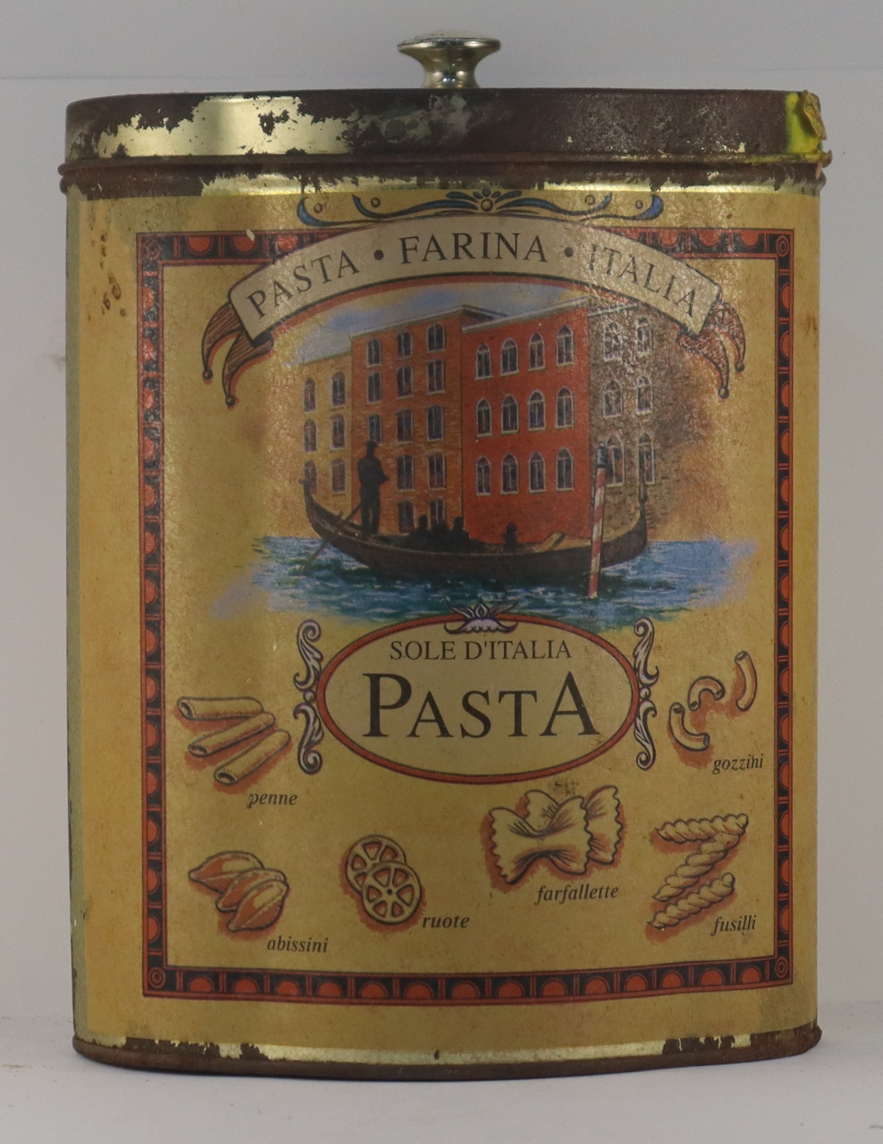 An oval shaped enamel tin which is wider in the centre than at the sides. On the front of the tin is a building surrounded by water and a gondola with people in it in front of the building. Around the bottom of the tin are pictures and words of the different types of pasta.