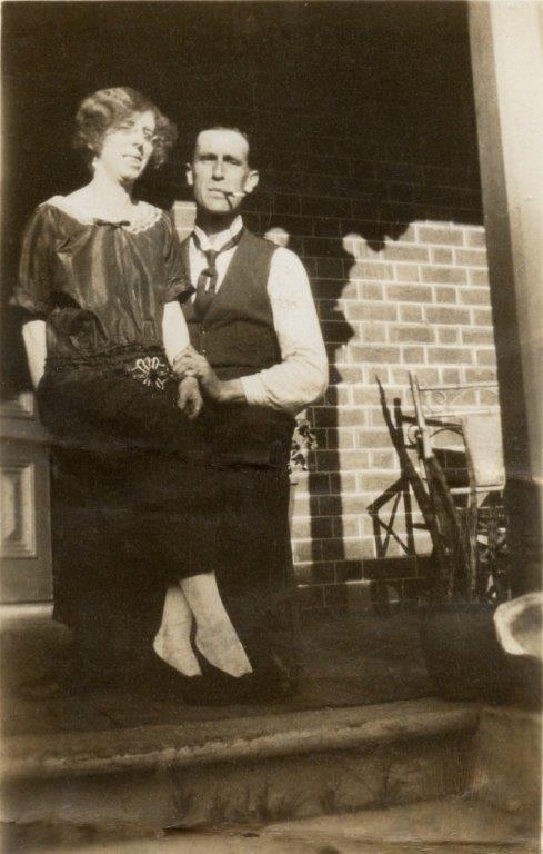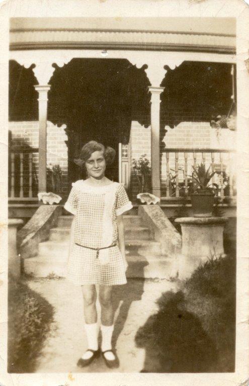 c. 1923B/W print. (a) Hubert and Caroline (Kit) de Waal on the front verandah of 14 Reserve Street Claremont. Hubert, dressed in dark trousers and shoes, long-sleeved white shirt with loose tie and dark waistcoat, is seated on a chair. He has a cigarette in a holder in his mouth. Caroline is sitting on his knee. She has a dark skirt with an ornate clasp at the waist and dark shoes. A lighter blouse is gathered at the round neck with a ribbon tie and white lace collar. The brick wall is behind them, with the door surround on the left, and the shadow of the verandah post and decorative bracket on the right. (b) Marie Claire (Molly) de Waal on the footpath at the bottom of the front steps at 14 Reserve Street, Claremont. She is in Iona Presentation Convent uniform of checked dress with dark tie at the hips, white collar, cuffs and front facing, white socks and black shoes. Details of original balustrade, verandah posts etc in the background.
