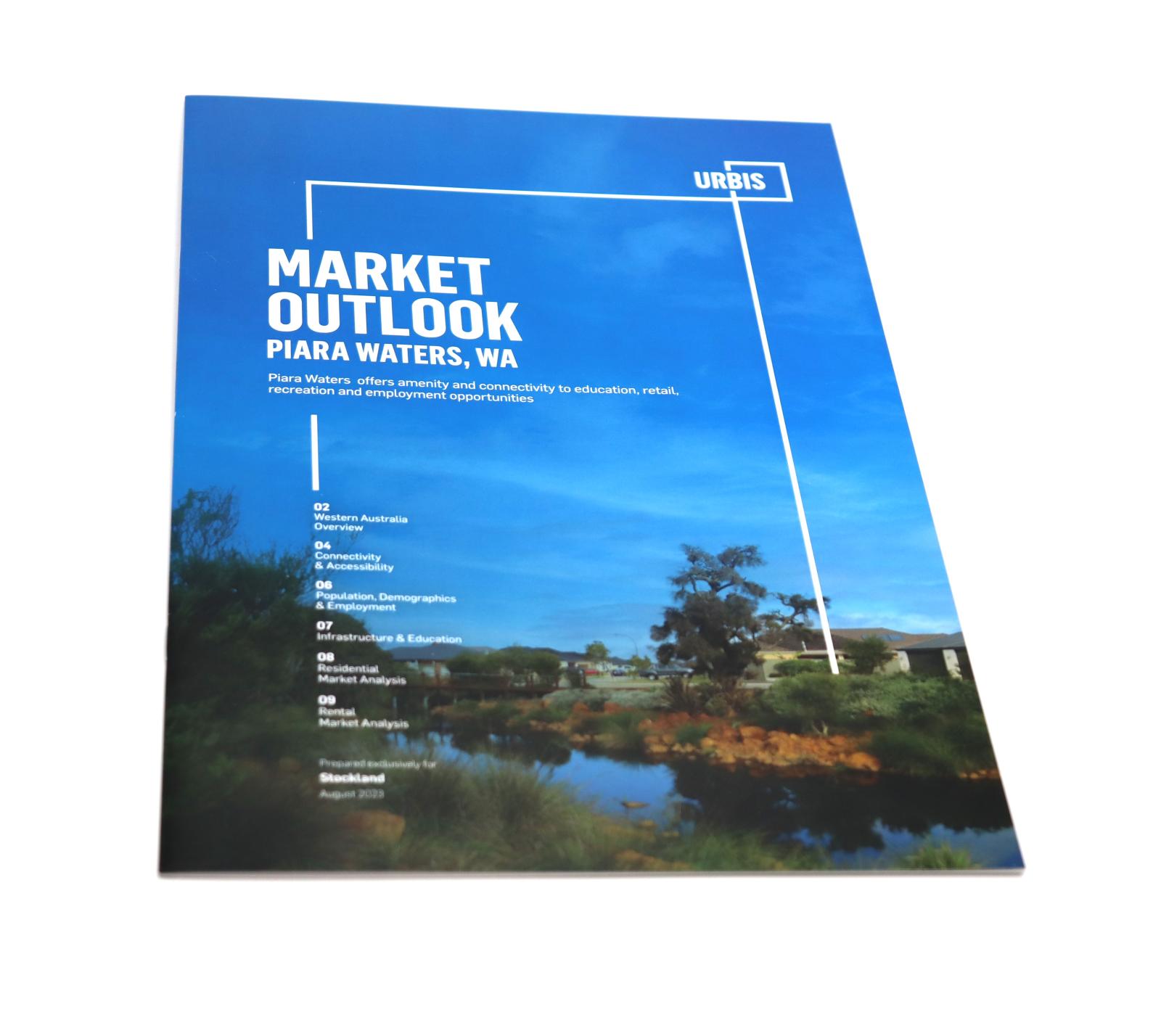 2023 - 2024Card covered booklet. The main colour for the front cover is blue and the back cover is black with white printing. On the front cover is a photograph of a creek and suburban housing beyond this. Printed at the top of the front cover in white is [URBIS]. Below this is printed [MARKET / OUTLOOK / PIARA WATERS, WA], with more details of the area and an index to pages printed in white on the lower front cover.