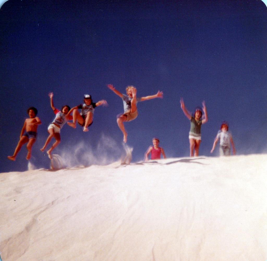 A coloured photograph of seven children in various action stages of jumping on top of a sand dune.