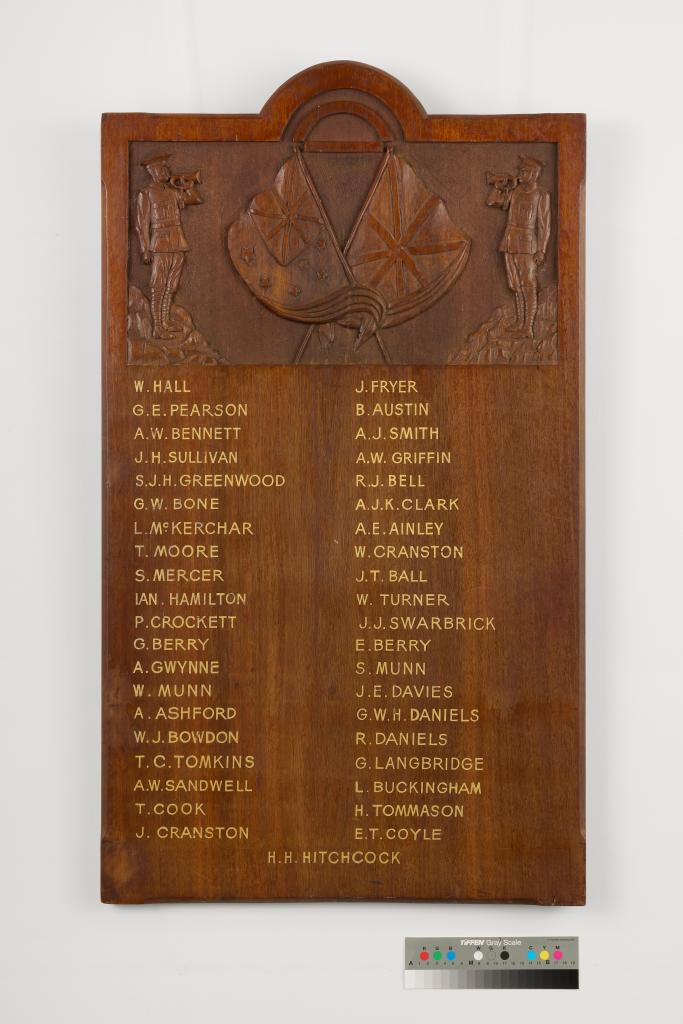 Honour Board - varnished carved wooden wall plaque. Rectangular with a feature curve in the middle of the top edge. The upper third of the board has a rectangular section of raised relief carving with 2 servicemen in World War 1 uniforms playing bugles and in the centre crossed Union Jack and Australian flags. The lower section has names inscribed in gold paint in two non-alphabetical rows with the exception of 'H. H. Hitchcock' whose name is shown bottom centre.