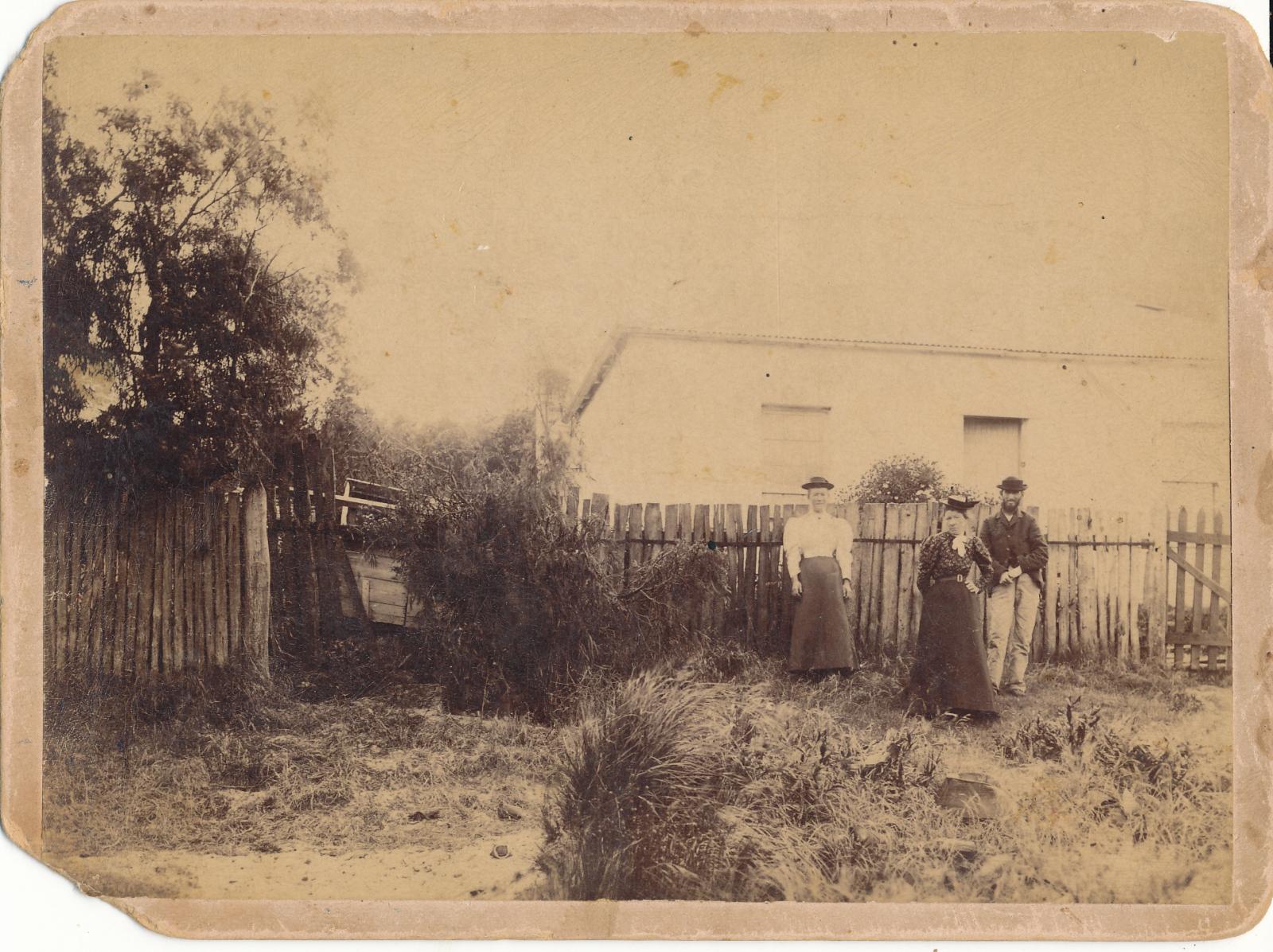 Mr & Mrs Dearle's home - Kojonup Three persons leaving for church- dark frock - Mrs Dearle, gentleman Mr Dearle, white blouse - Rose Julia Norrish - daughter of Richard Norrish and mother of Mrs A.J. Litster, 18 Narkunda st CLanders S.A. - presenter of photo See also P1998 2.12