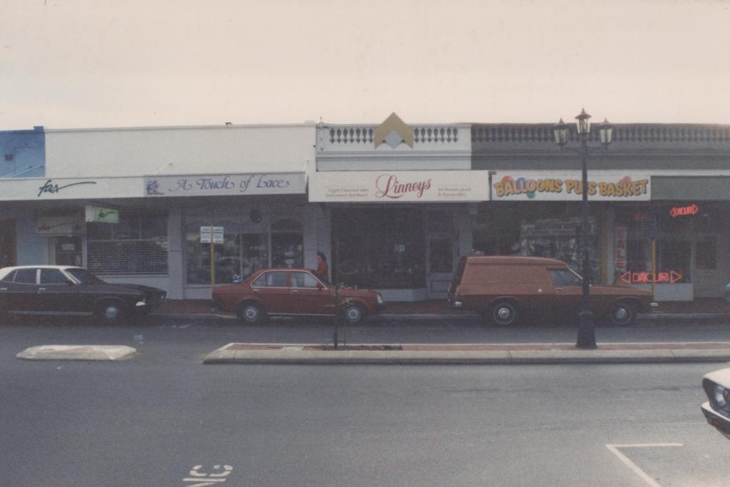 1988Coloured photograph showing an elevation of Rokeby Road shops from 21-17 Rokeby Road. The buildings have verandahs and the shop names are seen on the verandahs. The shops lifted from left to right: 'fax', 'A Touch of Lace', 'Linneys' and 'BALLOONS PLUS BASKET'. Cars are seen on the road.