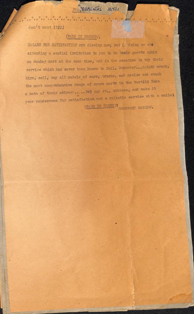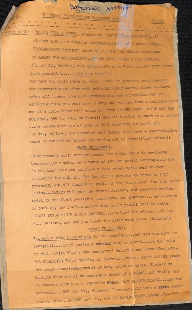 Script is for a radio programme, including advertisements, and discusses Sagar Motor Cycle and Car Hospital which was at 365 Hay Street Subiaco.