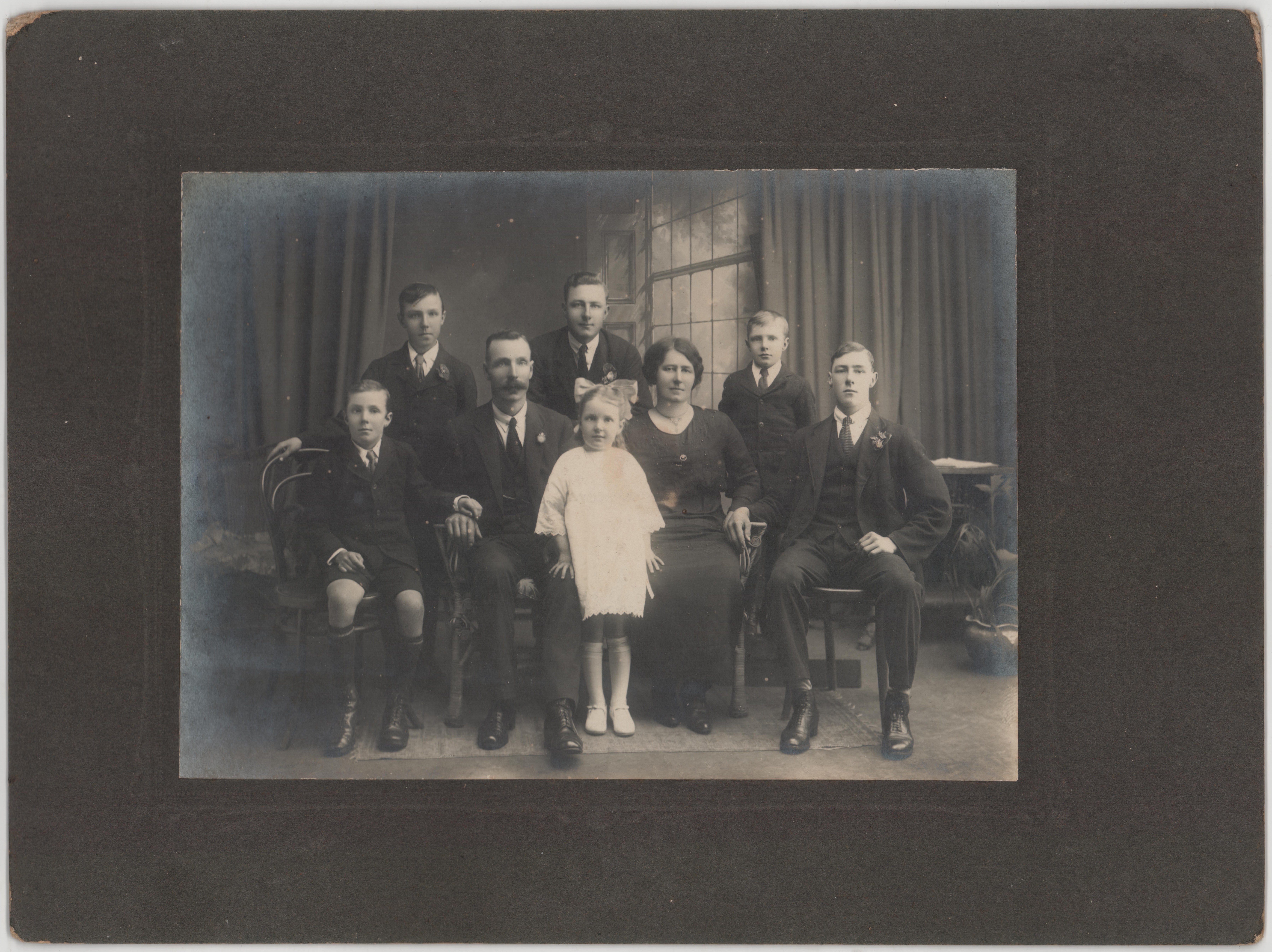 c. 1925A sepia photograph of a family, husband, wife, five boys and one girl. The husband and wife are seated in the centre, the young girl standing between them, the oldest son on the mother's left, another son on the father's right, and three other boys standing behind them.