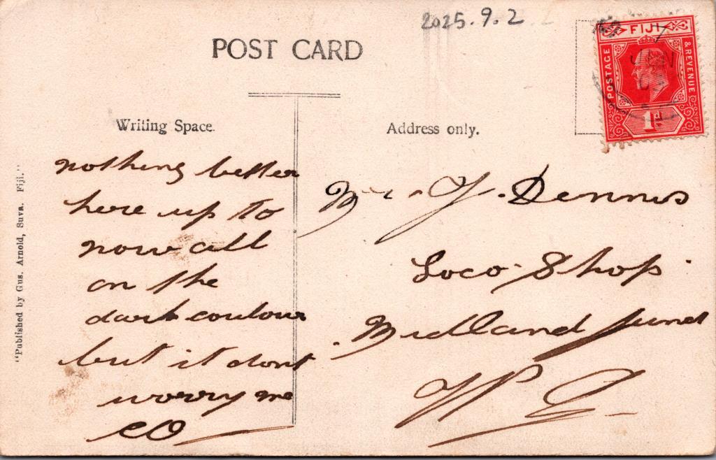 From a group of 3 postcards sent to Mr James Dennis from his friend in Fiji.