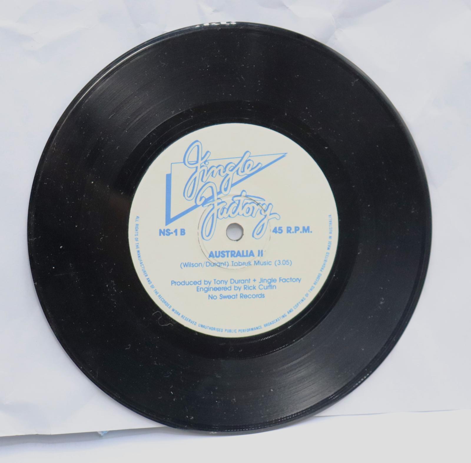 The makers mark for [Jingle Factory] is prominent at the top of the label, with {NS-1 A 45 R.P.M.] printed below this. On the lower half of the label is the song name [AUSTRALIA II] and below this is printed [(Wilson/Durant) Tobruk Music (3.05) / Produced by Tony Durant + Jingle Factory / Engineered by Rick Curtin / No Sweat Records]. A rights notice is printed in fine print around the lower half of the label. The same song appears to be on both sides of the record.