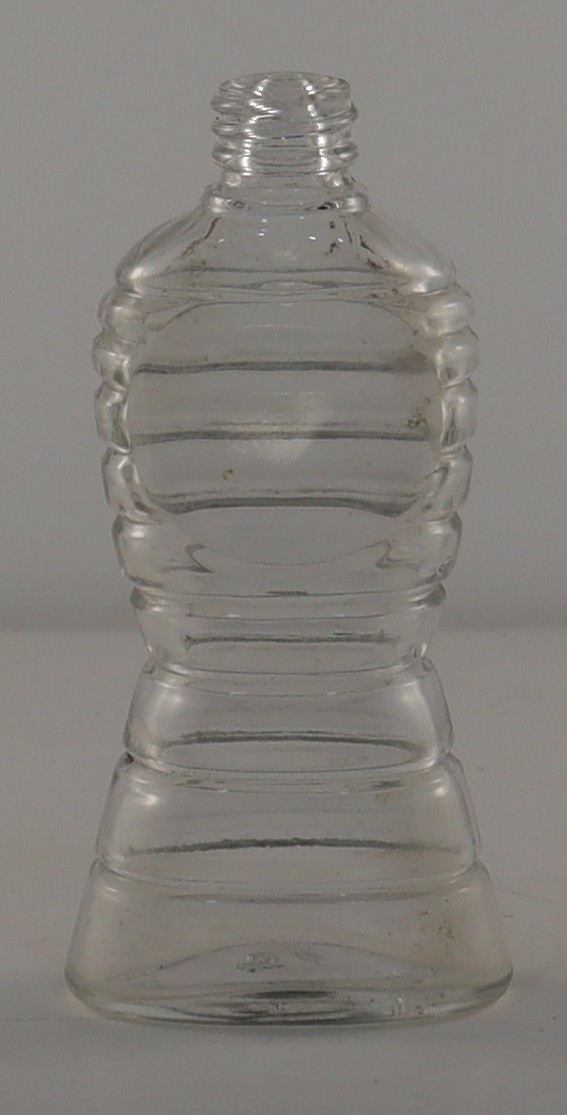A clear bottle with ridges on the body of the bottle. The bottle narrows a third of the way and then widens again.