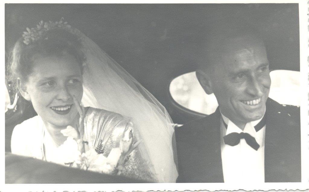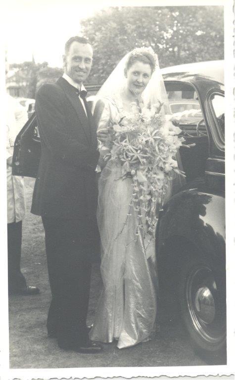 B/W Prints. (a) Dudley and Thelma Barton about to enter a dark car following their weding. Trees in the background. (b) Head and shoulder shot of Thelma and Dudley Barton in the back seat of the car.