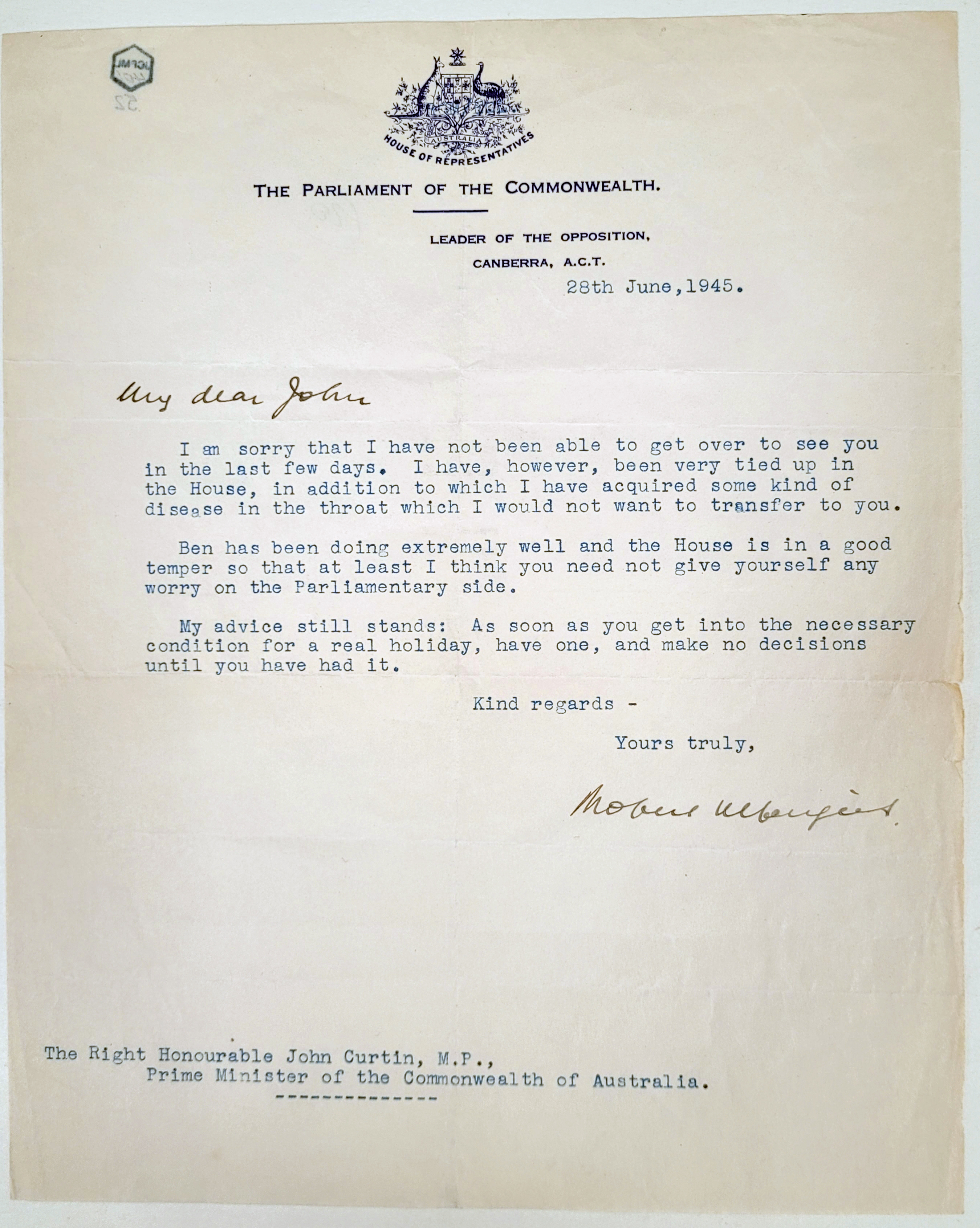 1945Leader of the Opposition Robert Menzies was writing to Prime Minister John Curtin just a week before his death.