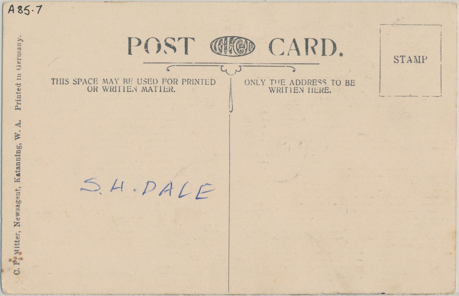 On the back of the postcard in blue ink is handwritten 'S.H.DALE'