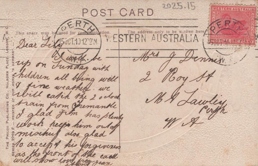 The reverse has a handwritten message adressed to 'Mrs J Dennis / 2 Roy St / Mt Lawley / Perth / WA', from Jean speaking about Jim forgiving her.
