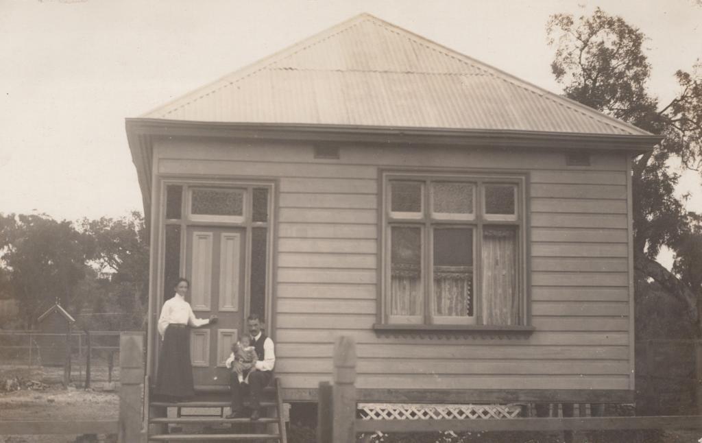 c. 1913Postcard showing a family in front of a wooden house with a hipped roof. The family consists of a mother, a father and a baby. The father is sitting on top of a staircase in front of the main entrance, holding the baby.