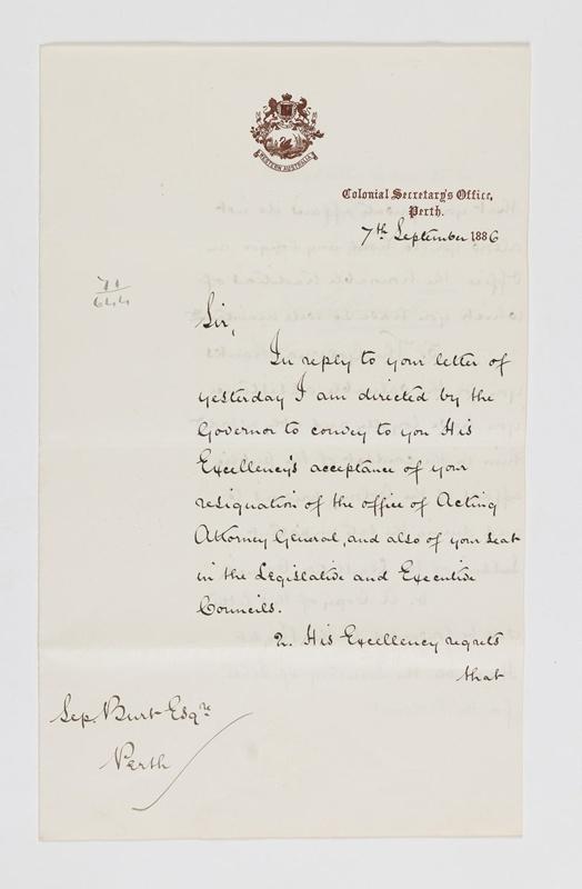 1886Letter dated 7 September 1886 from Matthew Skinner Smith, Acting Colonial Secretary, reluctantly accepting - on behalf of the Governor - Burt’s resignation the day before from the role of Acting Attorney-General as well as his seat on the Legislative & Executive Councils. Acknowledging Burt’s reasons that his private affairs did not allow him to continue and that the Secretary of Colonies would be duly advised. Dated 7 September 1886.