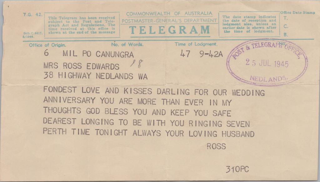 Telegram reads, 'MRS ROSS EDWARDS / 38 HIGHWAY NEDLANDS WA / FONDEST LOVE AND KISSES DARLING FOR OUR WEDDING ANNIVERSARY YOU ARE MORE THAN EVER IN MY THOUGHTS GOD BLESS YOU AND KEEP YOU SAFE DEAREST LONGING TO BE WITH YOU RINGING SEVEN PERTH TIME TONIGHT ALWAYS YOUR LOVING HUSBAND / ROSS'.