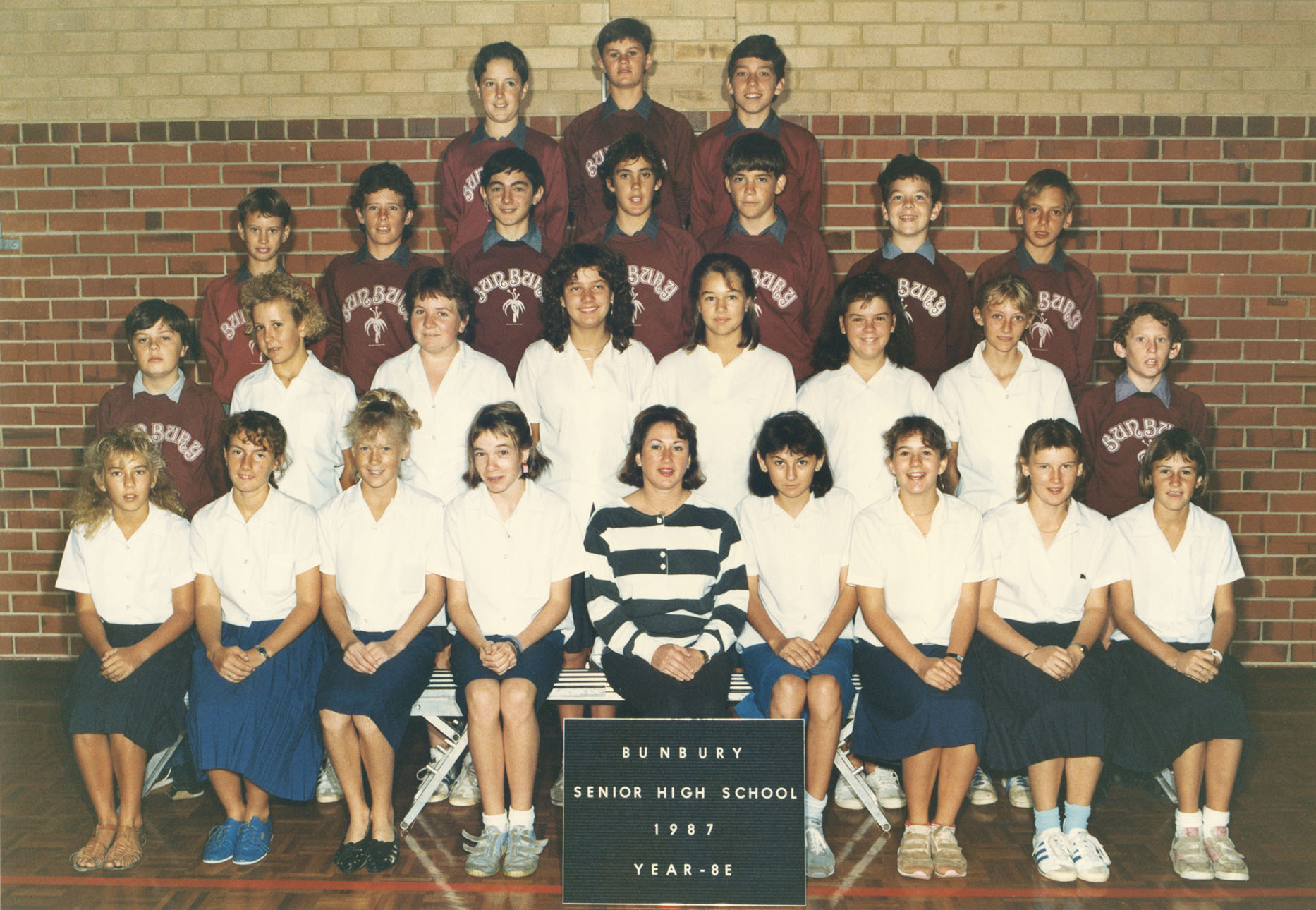 1987Formal class photograph of Year 8E with teacher Jacqui Kehoe.