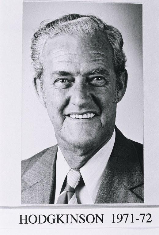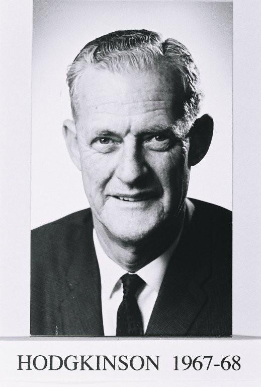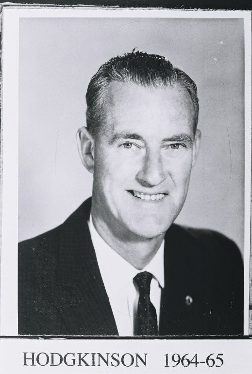 B/W Prints. Three head and shoulder portraits of Councillor Hodgkinson. a) He is wearing a dark jacket and tie with a light coloured shirt, and is smiling, clean shaven and has short slicked back hair. Printed beneath [Hodgkinson 1964-65]. b) Hodgkinson is wearing similar clothing and appears to have aged since earlier photograph. Printed beneath [Hodgkinson 1967-68]. c) Hodgkinson is wearing a lighter jacket and patterned tie with a light coloured shirt. He is smiling and his grey hair is short and waved. Printed beneath [Hodgkinson 1971-72].