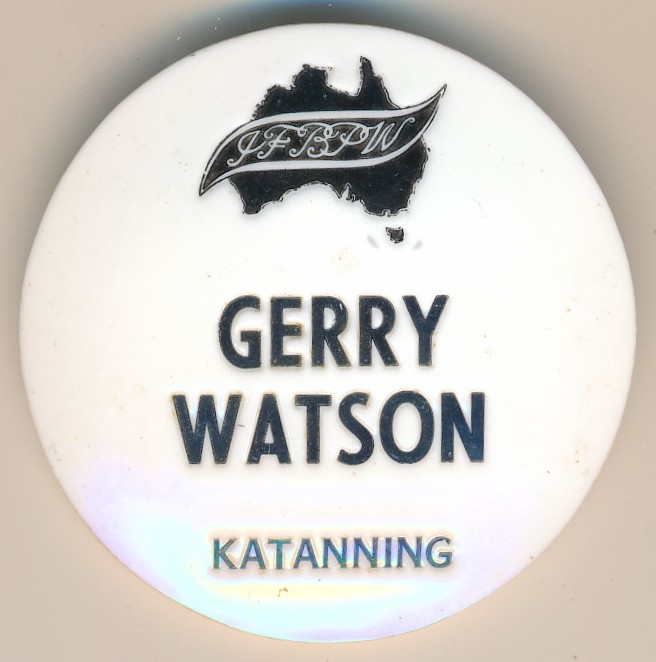 At the top of the badge is etched a map of Australia in black with a white scroll with the letters "IFBPW" in white in the middle of the scroll.