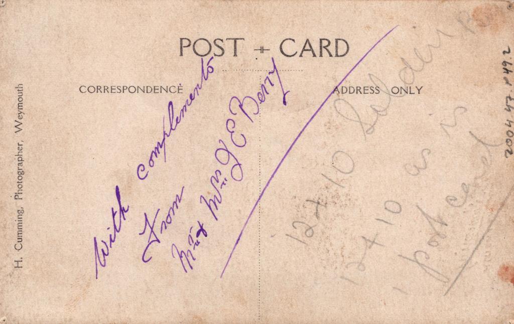 Reverse: Written in blue pen 'With complements From .….? E Berry'
