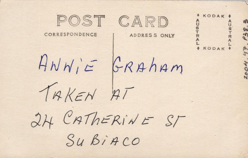 Reverse: Written in blue pen 'ANNIE GRAHAM' and in black pen 'TAKEN AT 24 CATHERINE ST SUBIACO'