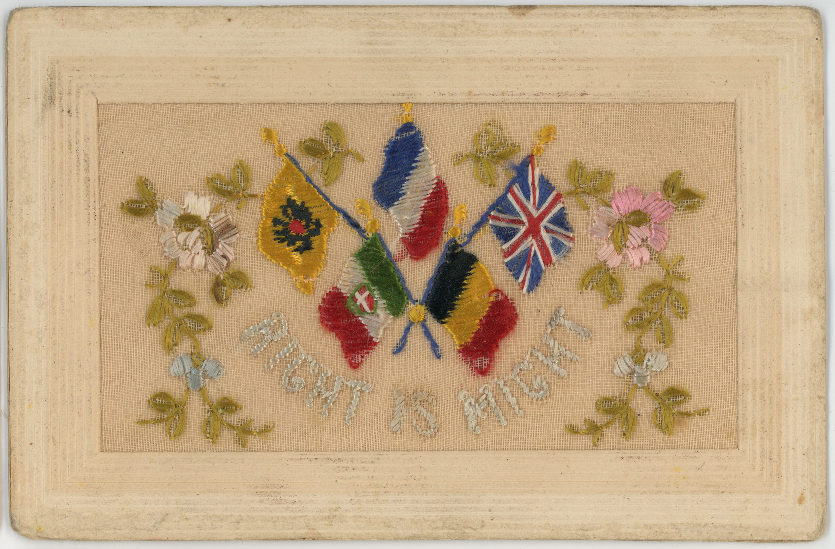 1914 - 1918First World War Silk Postcard with “’Right is Might’ embroidered below the allies’ flags of Russia, France, United Kingdom, Italy and Belgium in the centre of the postcard. There are two (2) sprays of small flowers, one on the left-hand and one on the right-hand side of the postcard. The manufacturer’s name is printed on the back.