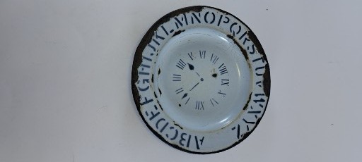 round white enamel child's plate. has print of a clock face in roman numerals in center of bowl, and upper case alphabet letters in a circle around outside edge of plate