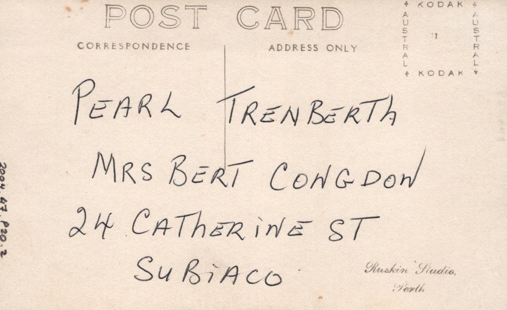 Reverse: Written in black pen 'PEARL TRENBERTH MRS B CONGDON 24 CATHERINE ST SUBIACO'