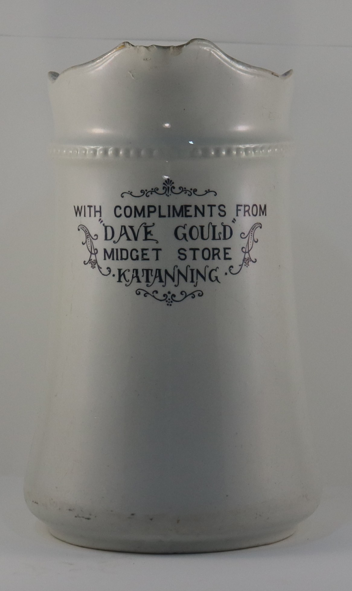 On the front of the jug below the pouring lip in black lettering is "WITH COMPLIMENTS FROM", underneath is "'DAVE GOULD', underneath is "MIDGHET STORE" and underneath is "KATANNING". This lettering is enclosed within floral scrolls.