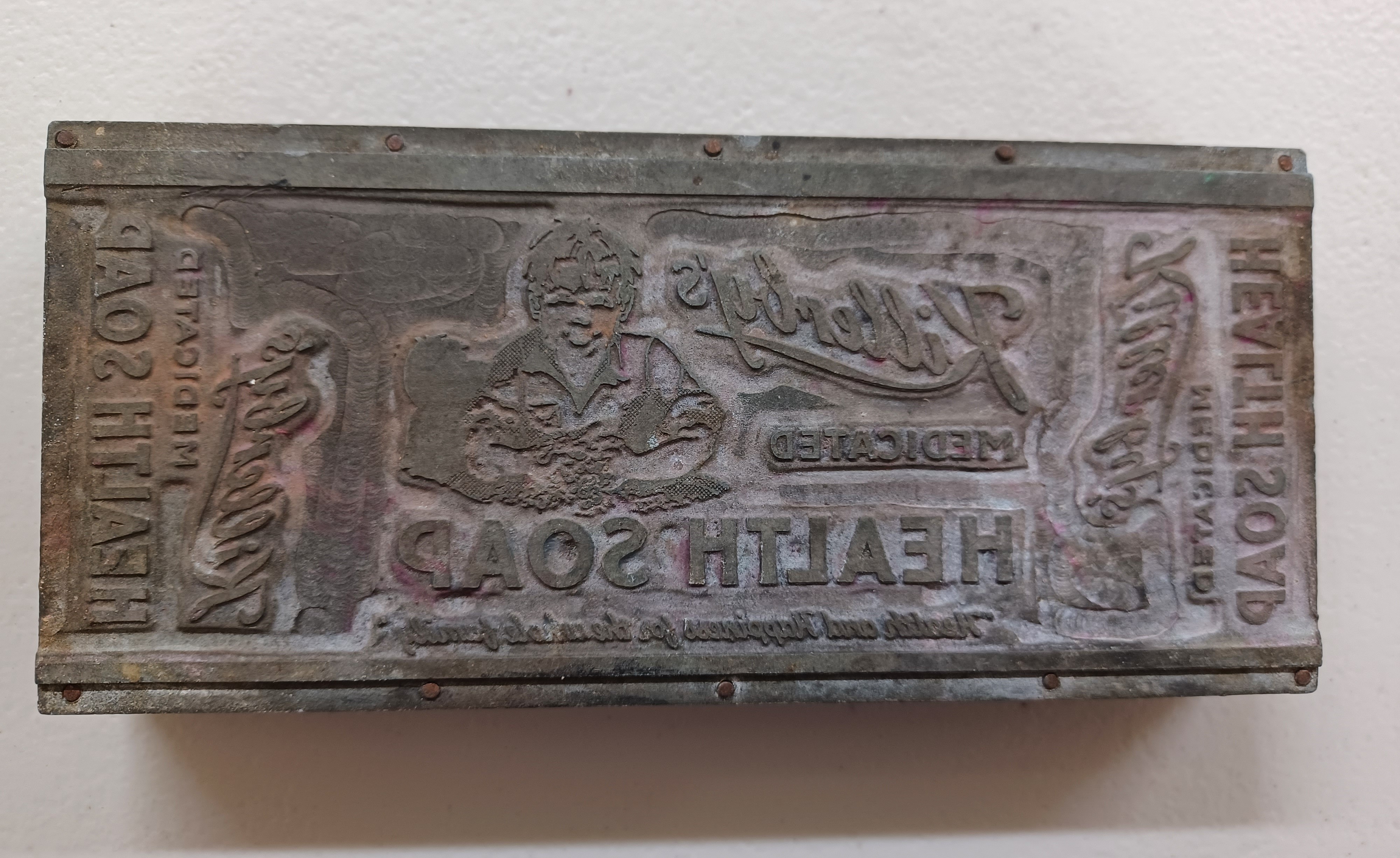 Metal stamp with text and images attached to a wooden base