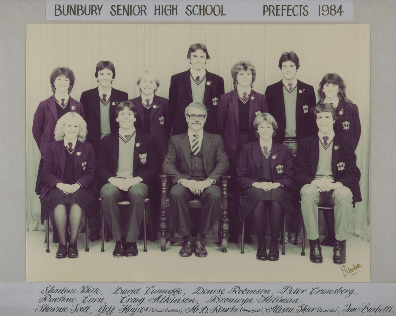1984Group photograph of the 1984 Bunbury Senior High School Prefects with principal David Rourke.