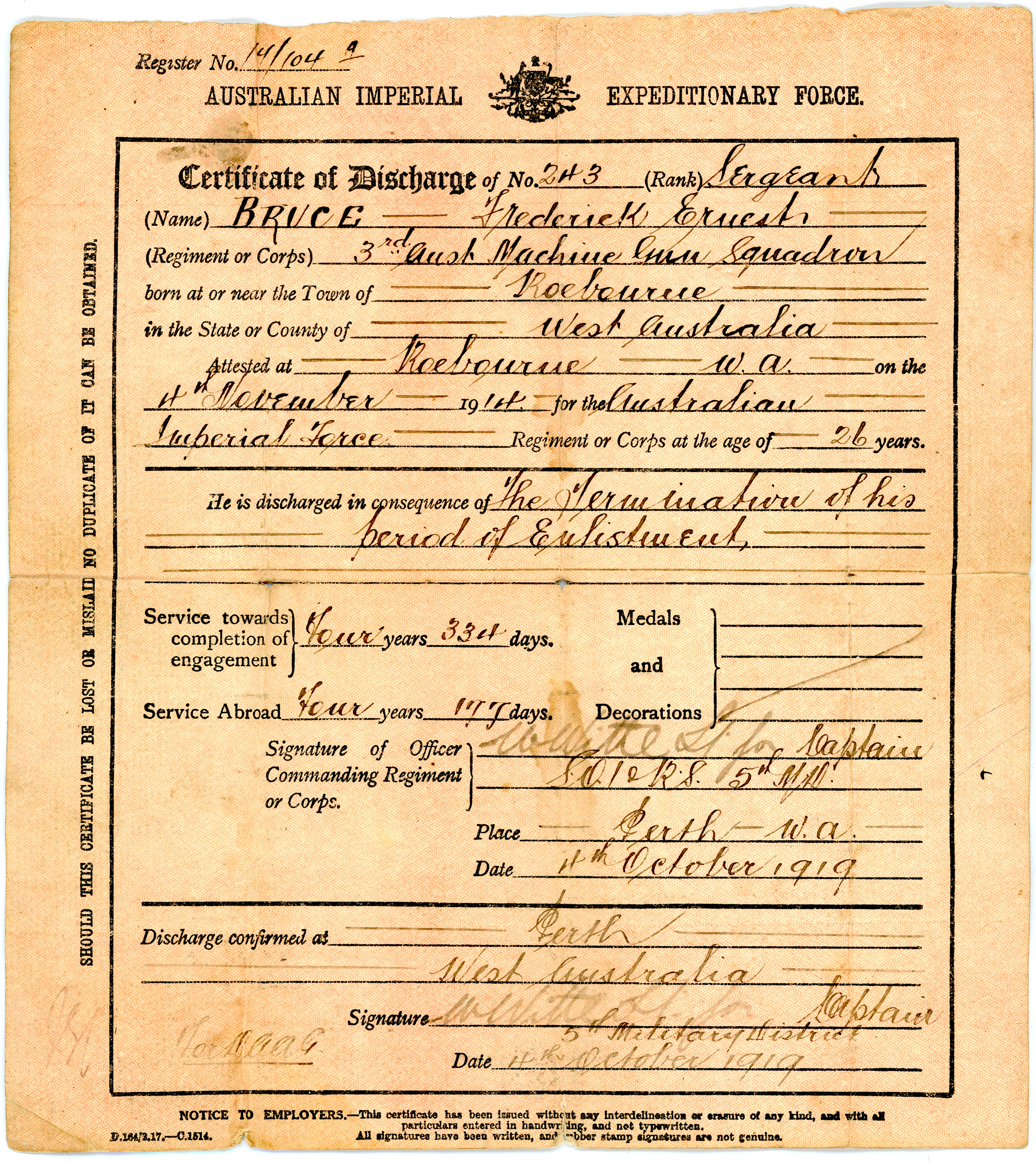 Front “Register No. 14/104 / AUSTRALIAN IMPERIAL EXPEDITIONARY FORCE / Certificate of Discharge of No 243 (Rank) Sergeant / (Name) BRUCE Frederick Ernest / (Regiment or Corps) 3rd Aust Machine Gun Squadron / born at or near the Town of Roebourne / in the State or County of West Australia / Attested at Roebourne W.A. on the / 4th November 1914 for the Australian / Imperial Forces Regiment or Corps at the age of 26 years. / He is discharged in consequence of the Termination of / his period of Enlistment / Service towards completion of engagement Four years 334 days. / Service Abroad four years 199 days. / Signature of Officer Commanding Regiment or Corps (illegible) Captain 5th MD / Place Perth W. A. / Date 4th October 1919 / Discharge confirmed at Perth / West Australia / Signature (illegible) Captain / 5th Military District / Fon D.A.A.G. date 4th October 1919. / NOTICE TO EMPLOYERS. – This certificate has been issued without any interdelineation or erasure of any kind, and with all / particulars entered in handwriting, and not typewritten. / All signatures have been written and rubber stamp signatures are not genuine. / D.164/2.17. – C.1514.” Vertically on the edge of the page “SHOULD THIS CERTIFICATE BE LOST OR MISLAID NO DUPLICATE OF IT CAN BE OBTAINED.”