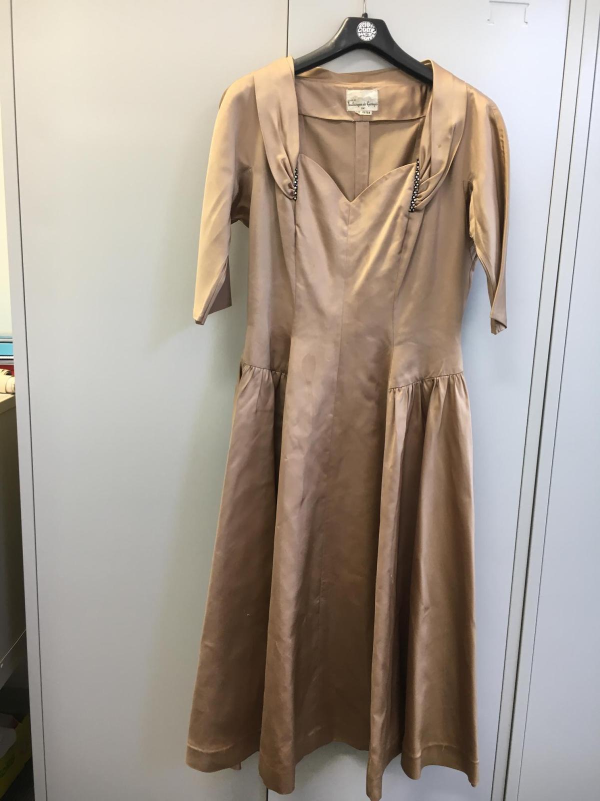 Brown Cocktail dress, stain feel, full skirt, waist gathering, mid-length sleeves