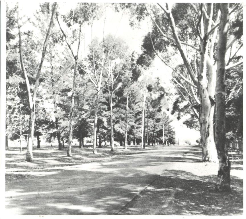 c. 1930 - 1939B/W print. Looking south towards the river from Princess Road. On the left is a row of young Sugar Gums (Eucalyptus cladocalyx) bordering the road, with a row of conifers behind them around the College Park oval. On the right is the fence of East Claremont Practising School.