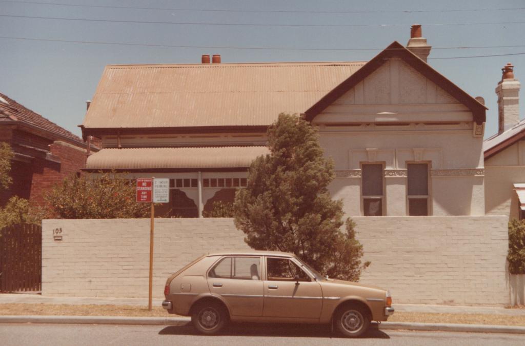1985Coloured photograph of a house at 103 Roberts Road. The house is a brick house painted white with a light grey pitched roof. The house has two chimneys. There is a bull nosed verandah with a light grey tin roof. The roof of the verandah is supported by white wooden beams. Beneath the roof of the verandah there is a decorative wooden framework. There are some ornamental decorations on the house. In front of the house, there is a brick wall painted white. In the top left corner of the wall, the number '103' can be seen. There is a grey car parked in front of the wall. Behind he car, there is a tall bush, partially covering the house. There is a traffick sign to the left of the bush and the car, reading 'NO STANDING AT ANY TIME'. In the top right corner of the image, a white brick chimney connecting to the neighbouring house can be seen.