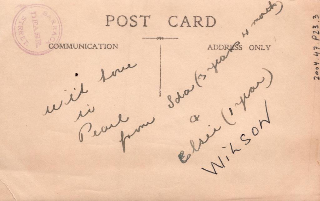 Reverse: Written in black pen 'With love ..? Pearl from Ida (3 years 4 months) & Elsie (1 year)' and 'WILSON'