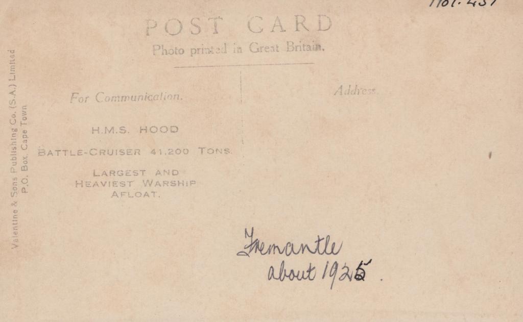 c. 1925Black and white photograph of the HMS Hood in Fremantle. Another Navy ship can be seen in the background at the right. Information printed on reverse: 'Battle-cruiser 41,200 tons. Largest and heaviest warship afloat.' In ink is written: 'Fremantle about 1925'. The card is unused. Valentine and Sons Publishing Co. (SA) Limited, Cape Town.