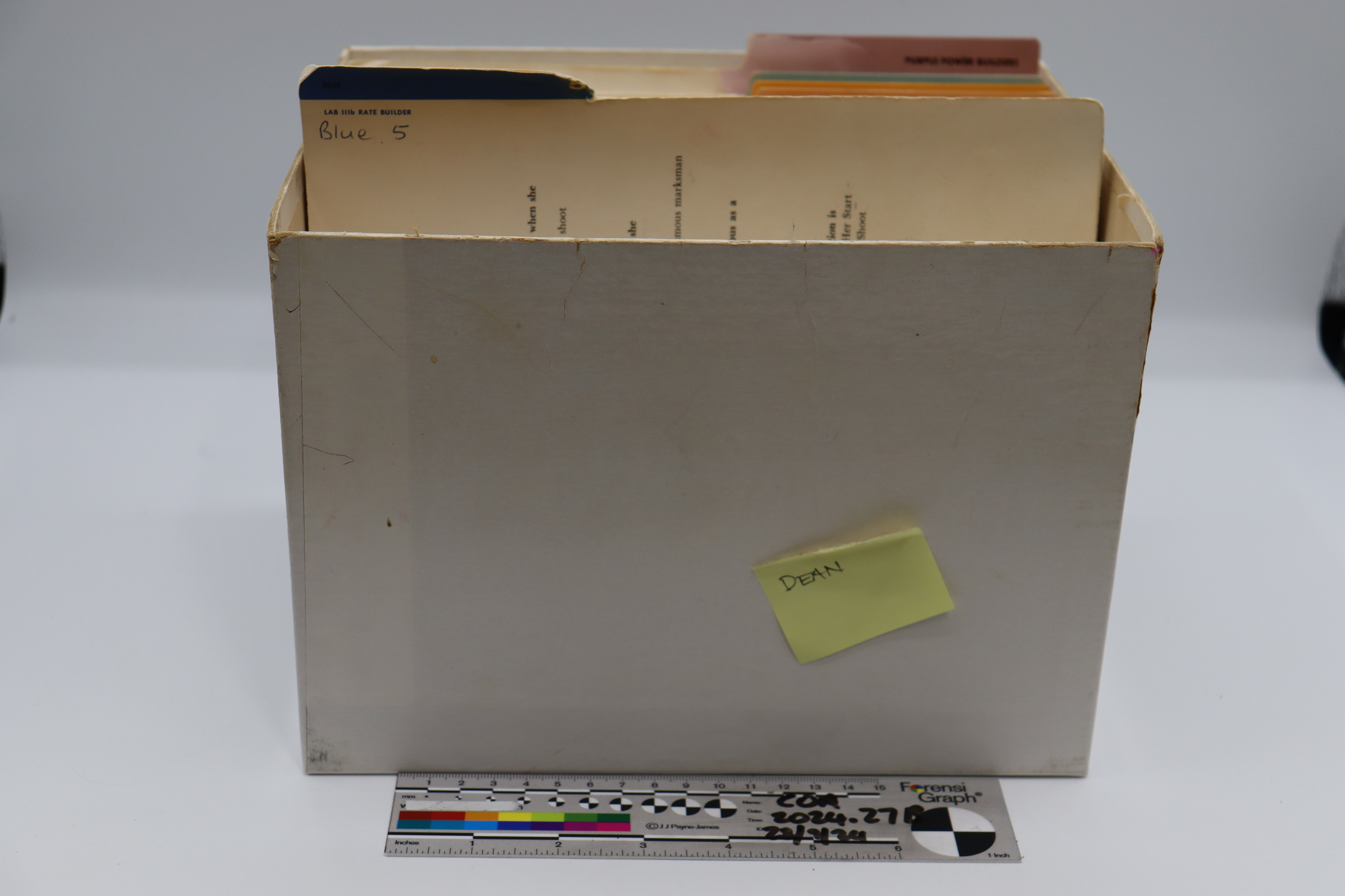 c. 2009White cardboard box with a green card sheet attached to it by a small clip. Hand-written at the top of the card, in red ink, is [READING / POWER BUILDERS]. Below this, hand-written in blue and red ink, are instructions on how to use the cards inside the box. Contained in the box are cards pertaining to increasing ones speed at reading. The cards are divided into 9 colour coded categories (blue, rose, brown, green, red, tan, gold, aqua & purple). Each category contains 16 separate cards with a printed passage and questions about that passage.