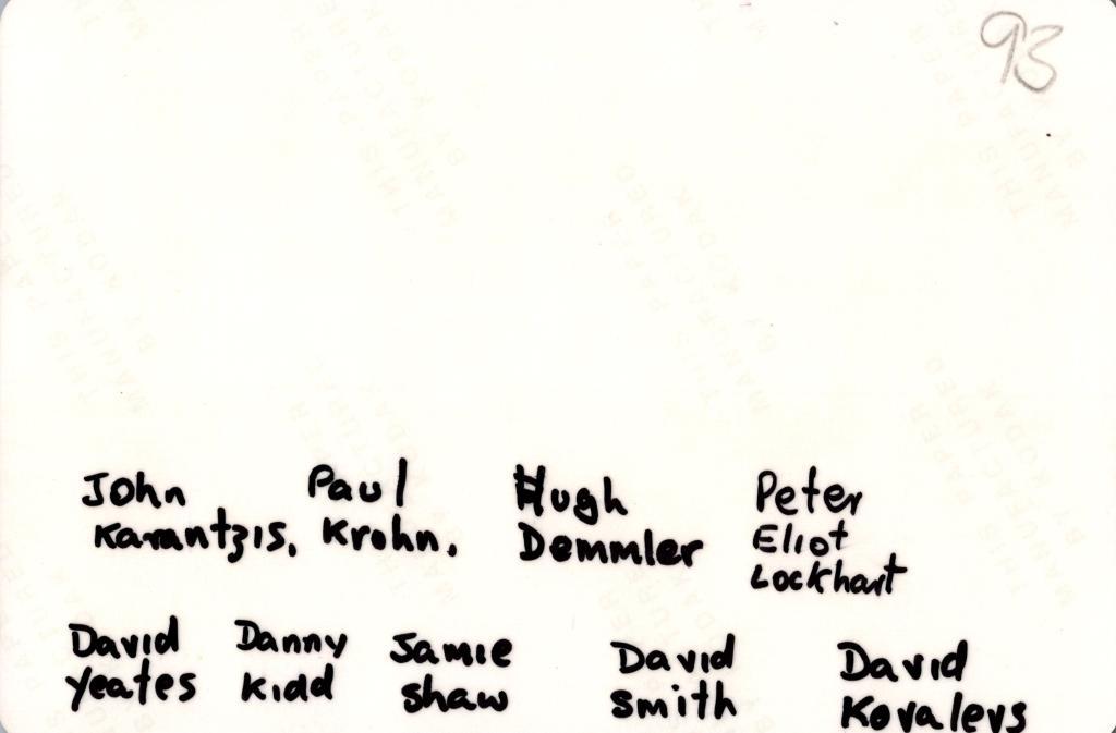 Reverse: Handwritten text in black ink in two lines at the bottom describing the names of the boys featured in the photograph. Top line (from left to right): John Karantzis, Paul Krohn, Hugh Demmler, Peter Eliot Lockhart. Bottom line (from left to right): David Yeates, Danny Kidd, Jamie Shaw, David Smith, David Kovalevs.