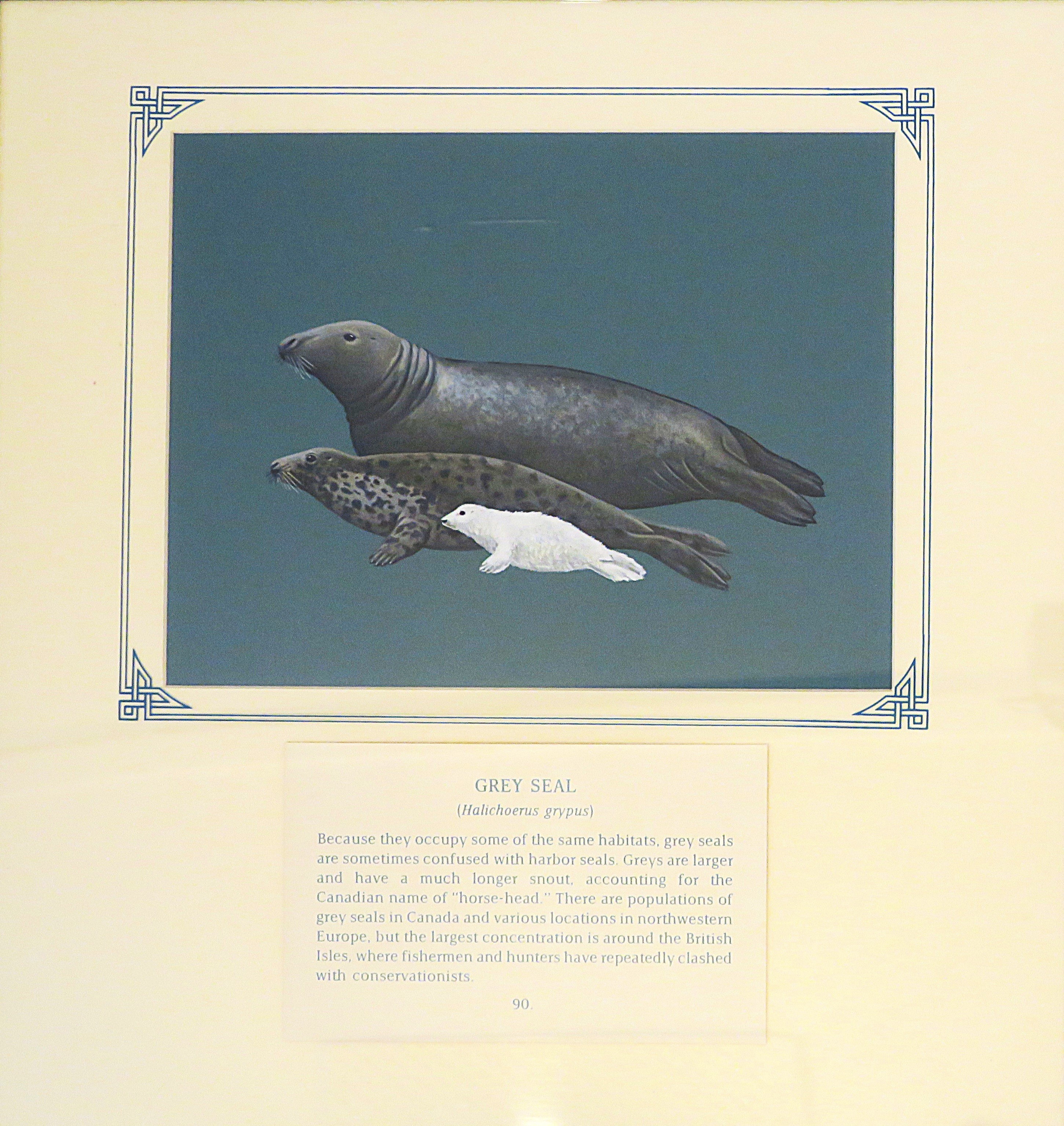 c. 1985Painting of family of 3 seals, long hooked -shaped noses. - adult is grey all over; adult female - grey with black spots, with white pup, gouache on blue card, framed and mounted with inscription (90).
