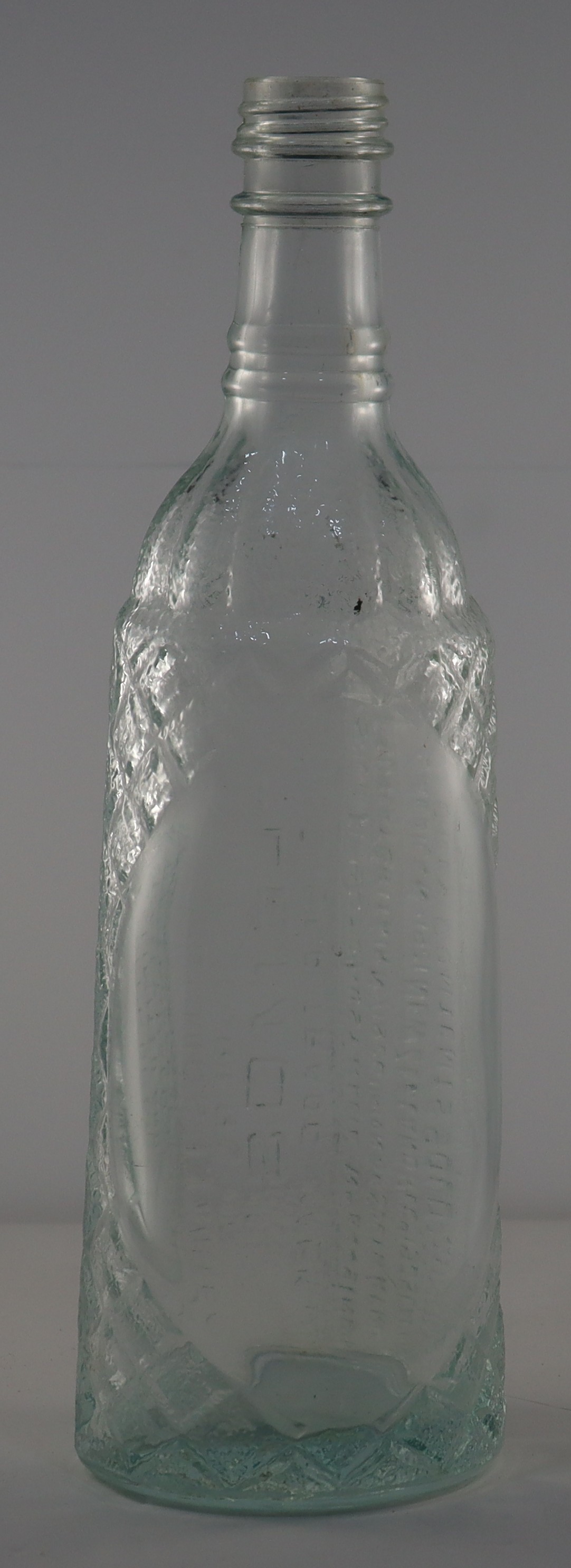 c. 1940 - 1950A light green translucent circular bottle at the front, but it then has two flat sides and a flat back. The front has a diamond pattern around an flat clear oval shape, the shoulder of the bottle is fluted. The remainder of the bottle has a rough texture.