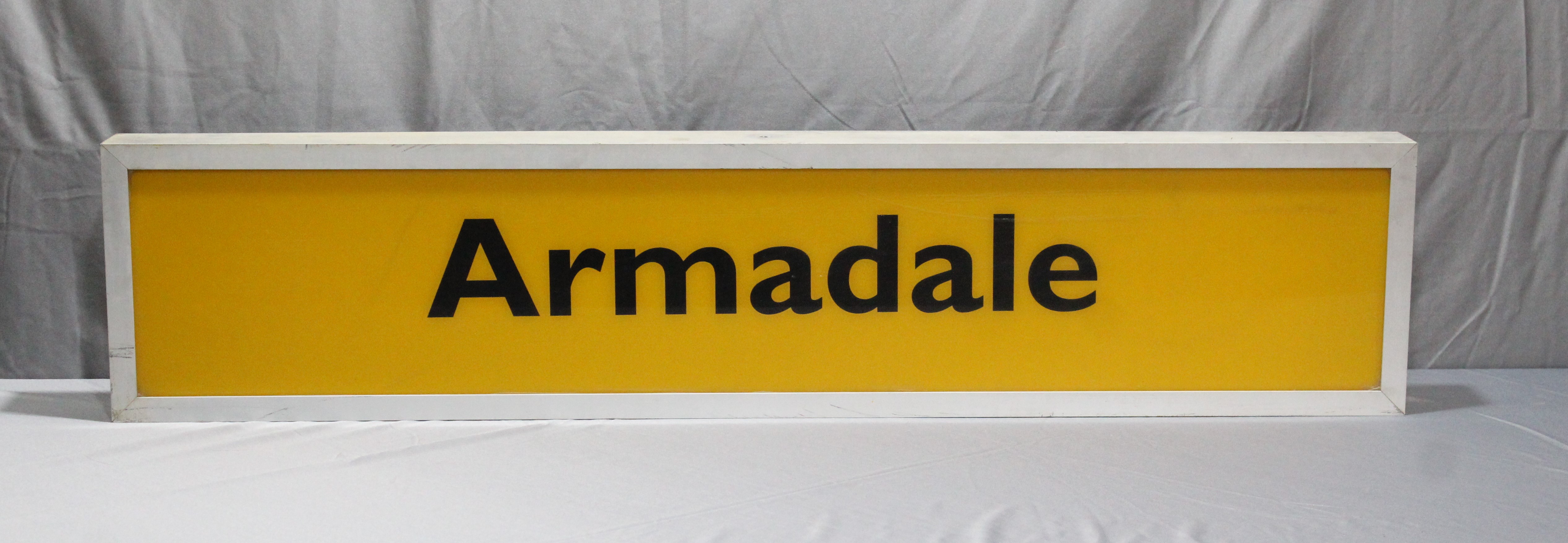 Long rectangle metal sign with the word "Armadale" across the front of the sign in black letters. The sign face (front) is yellow and have a light grey metal frame surrounding the yellow and the rest of the sign. There is a small hole on the top of the sign and minor metal scuff marks can be seen.