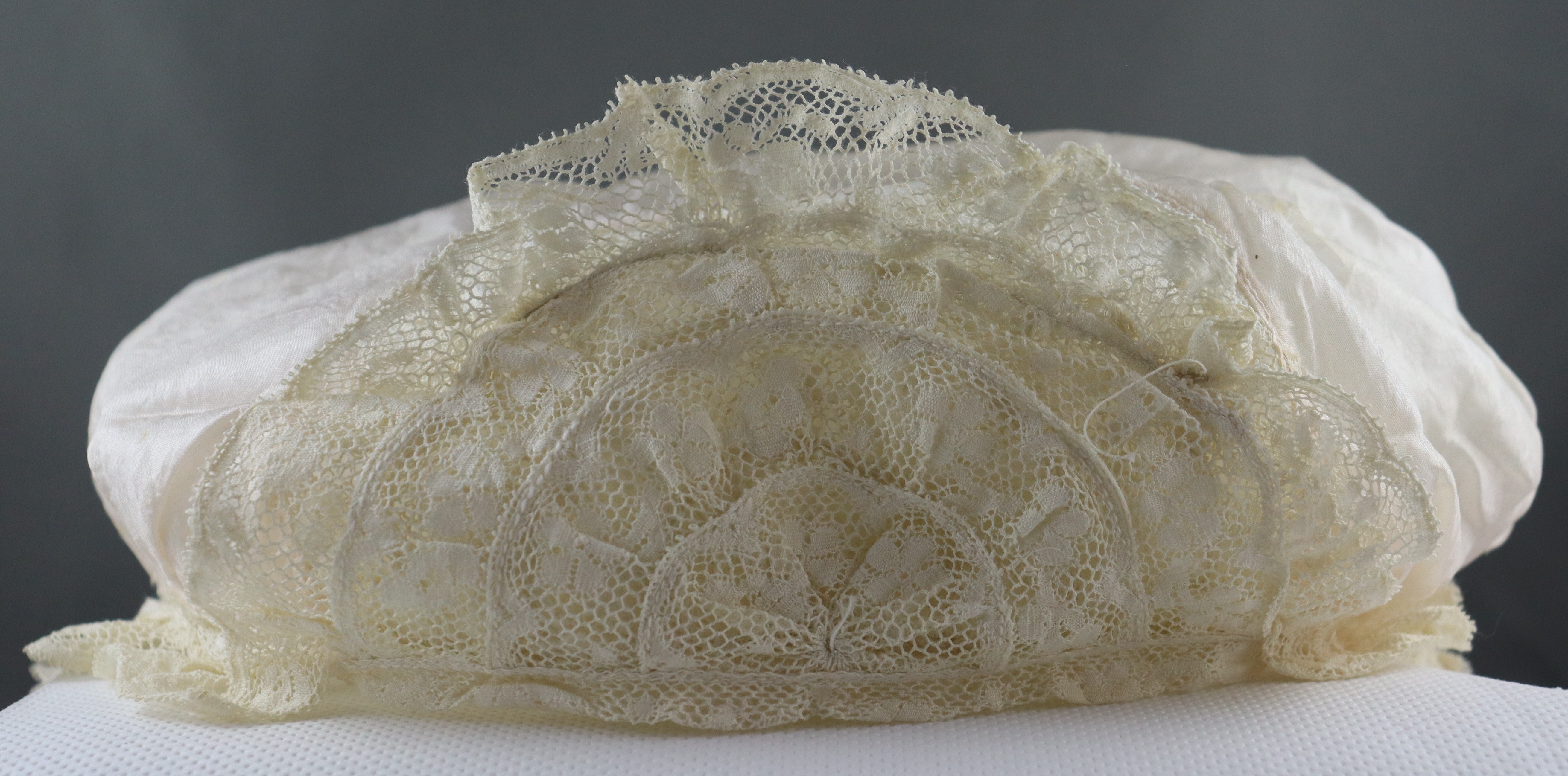 A cream silk circular bonnet with lace edging around the bottom of the bonnet. At the front and back there are four layers of lace edging to make a semi-circle on the bonnet.
