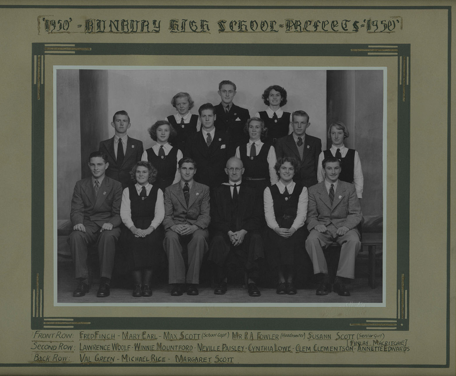 Front: Fred Finch, Mary Earl, Max Scott (School Captain), Russell A. Fowler (Headmaster), Susann Scott (Senior Girl), Finlay MacRitchie