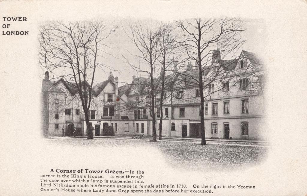 Bottom centre reads: 'A Corner of Tower Green. - In the / corner is the King's House, it was through / the door over which a lamp is suspended that / Lord Nithsdale made his famous escape in female attire in 1716. On the right is the Yeoman / Gaoler's House where Lady Jane Grey spent the days before her execution.'