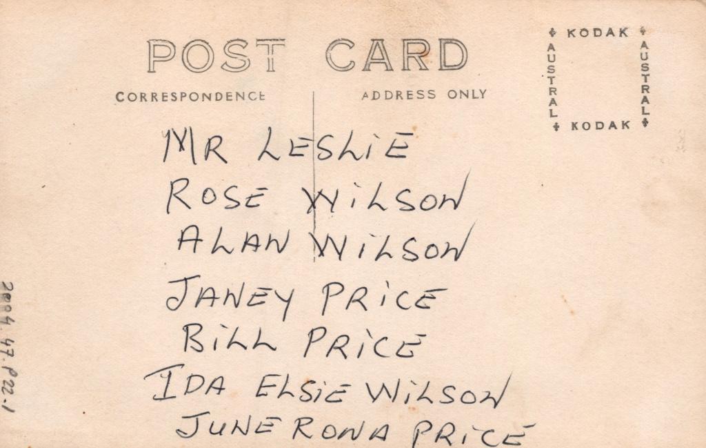 Reverse: Written in black pen 'MR LESLIE ROSE WILSON ALAN WILSON JANEY PRICE BILL PRICE IDA ELSIE WILSON JUNE RONA PRICE'