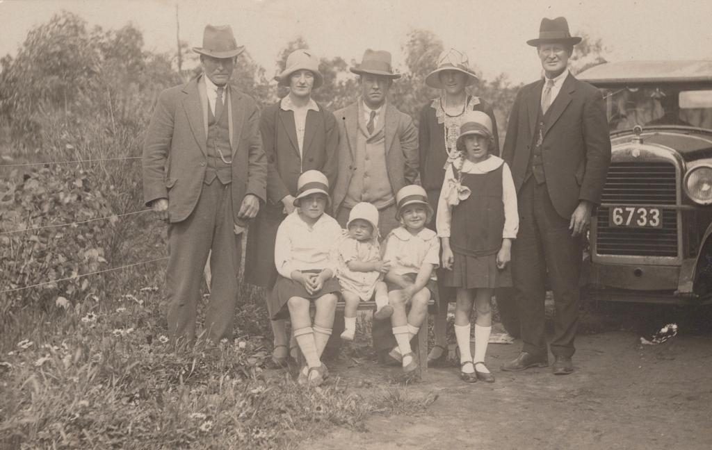 c. 1913Postcard showing a group of people. The group: Mr Leslie, Rose Wilson, Alan Wilson, Janey Price, Bill Price, Ida Wilson, Elsie Wilson, June Price and Rona Price.