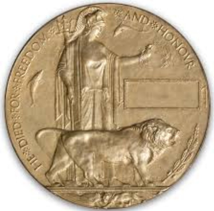 The 1914-1918 Memorial Plaque is a 120mm diameter bronze commemorative medallion which was presented to the next-of-kin of the men and women who died during World War One. The bronze medallion features an image of Lady Britannia surrounded by two dolphins (representing Britain’s sea power) and a lion (representing Britain) standing over a defeated eagle (symbolising Germany). Around the outer edge of the medallion are the words ‘He died for freedom and honour’ The shape and appearance of the plaque earned it nicknames such as the "Dead Man's Penny", the "Death Penny", and the "Widow's Penny".